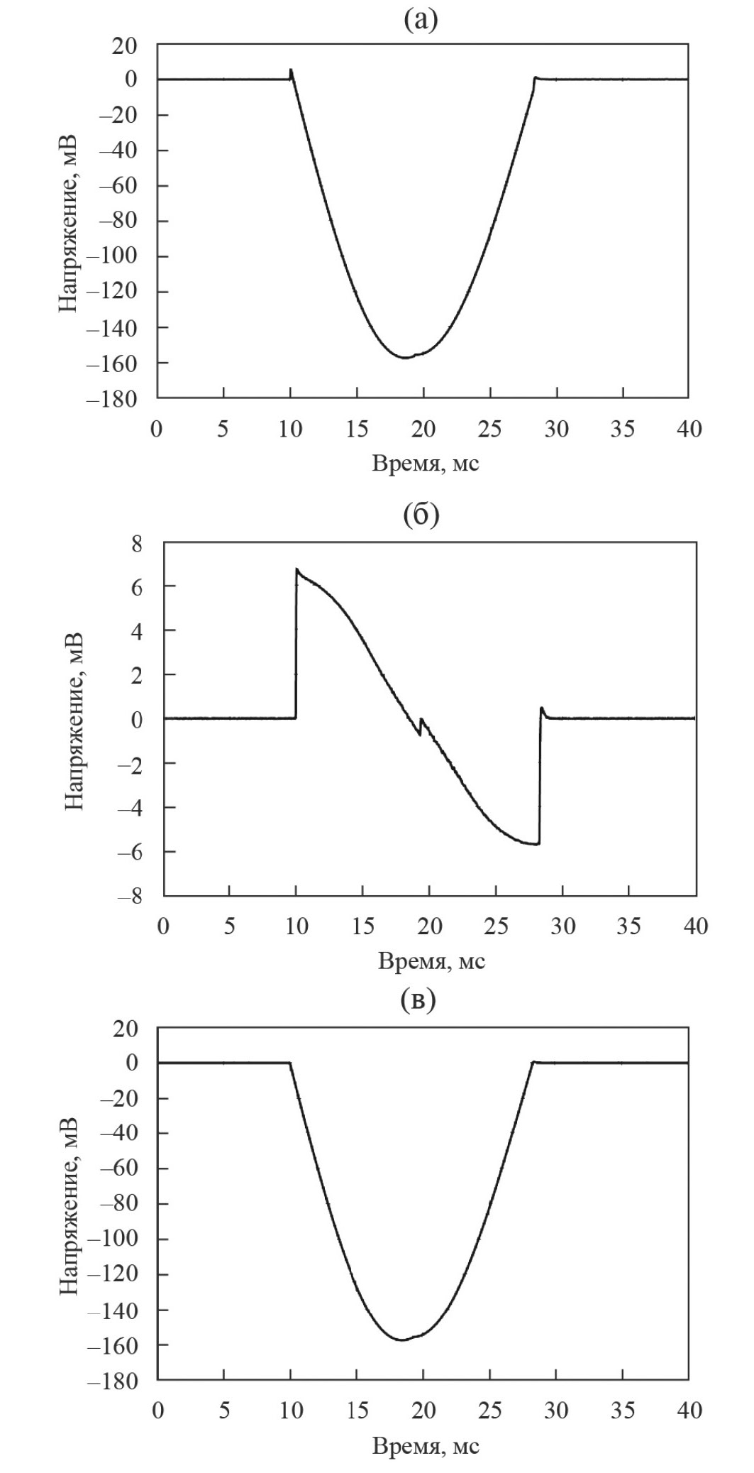 На рис. 8 показаны осциллограммы магнитного поля, зарегистрированные с одного из холловских датчиков каретки. Осциллограмма на рис. 8а демонстрирует суммарный сигнал, где к датчику Холла добавляется “паразитный” индукционный сигнал. Его примерная величина хорошо видна из небольшого положительного пика в начале осциллограммы, который появляется вследствие скачка производной поля. На следующей осциллограмме (рис. 8б) показана индукционная наводка при выключенном токе. Сигнал растянут по вертикали по сравнению с предыдущим в 20 раз. Видимая немонотонность (скачок) в районе нуля − включение рекуперации в импульсном источнике. Осциллограмма на рис. 8в − это сигнал с рис. 8а минус сигнал с рис. 8б.