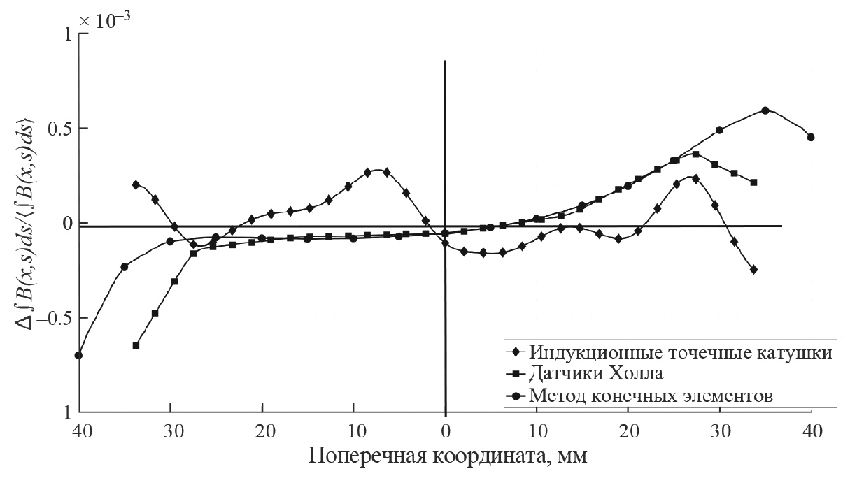 Главным критерием того, что магнит обеспечит успешное прохождение пучка по каналу, служат измерения интегральных и локальных распределений магнитного поля. На рис. 9 приведены графики поперечной зависимости интеграла, полученные расчетным путем с помощью метода конечных элементов [10] и измеренные с помощью преобразователей Холла и индукционных датчиков. Зависимость вычисляется с помощью следующего соотношения: