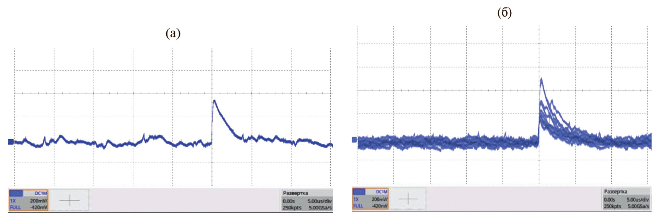 Рис. 6. Типичные осциллограммы сигналов от Cs-137: а − при загрузке, эквивалентной уровню нефти вблизи верхней границы, б − при загрузке, эквивалентной минимальному уровню нефти.