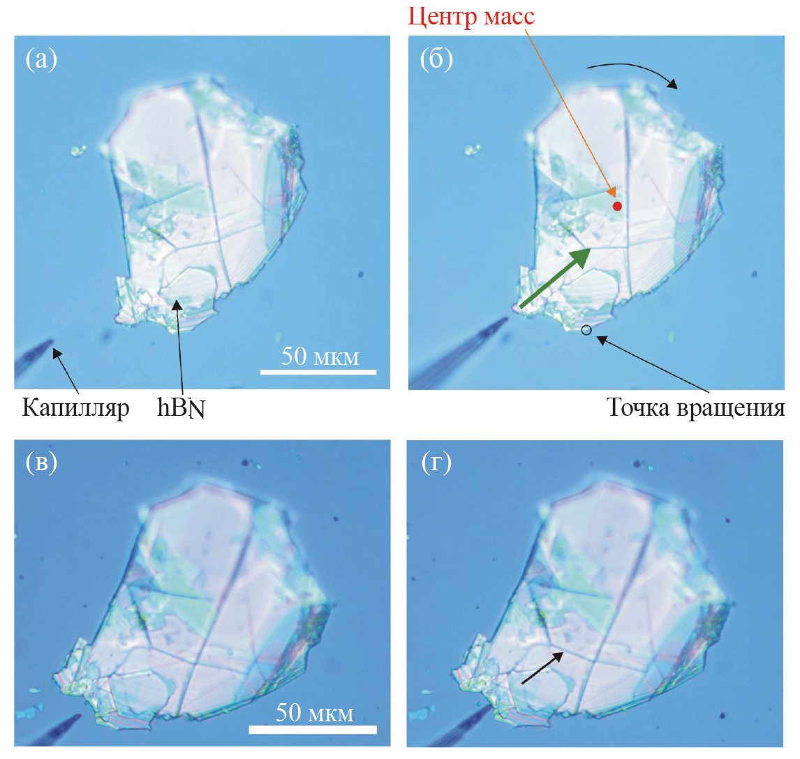 Как было отмечено ранее, лист hBN может быть “пришпилен” в некоторой точке к подложке, в этом месте возникает точка вращения, рис. 6. Наличие такой точки может оказаться полезным для удобного и точного позиционирования листа hBN, поскольку относительный угол между кристаллическими направлениями графена и лежащим на нем hBN может оказывать существенное влияние на электронный транспорт в графене [22–26]. Таким образом, возможность создания точки вращения в произвольном месте на листе hBN представляется важной. Пример создания такой точки представлен на рис. 7. Исходный лист (рис. 7а) сначала отделяется от поверхности (рис. 7б); свободно положенный на кремниевую подложку лист при этом остается подвижным и “плавает” по поверхности пленки воды (рис. 7в). Прижимание капилляром листа в точке, отмеченной красным кружком на рис. 7г–е, создает точку вращения, выдавливая в этом месте воду из-под листа hBN и увеличивая в этом месте взаимодействие Ван дер Ваальса между листом и подложкой. Таким образом, оказывается возможным вращение листа вокруг данной точки, рис. 7г–е.