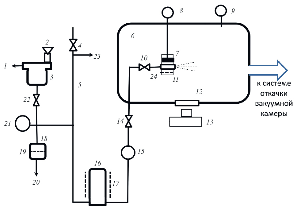 Этанол в систему подготовки и подачи жидкости заливается через отверстие 2 с заглушкой, отсекающей систему от атмосферы после заполнения. Уровень заливки системы жидкостью во время заполнения контролируется с помощью прозрачной трубки 5. После заливки жидкости при закрытых вентилях 4, 14 и открытом вентиле 22 камеры системы 3, 16, 18 нагреваются ленточным нагревателем до температуры дегазации 340 К. Жидкость дегазируется с помощью форвакуумной откачки через канал 1. По завершении дегазации вентиль 22 закрывается. Электромагнитный клапан 10 со временем срабатывания 20 мс предназначен для быстрого отсечения канала подачи жидкости в сопло после завершения эксперимента. Расход жидкости контролируется ротационным расходомером FM-HL3012C 15 с погрешностью 3%.
