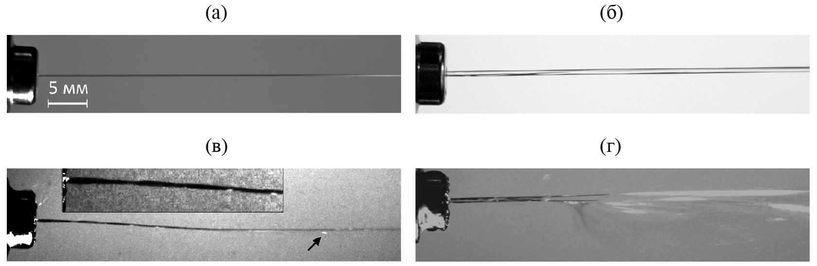 Иллюстрация результатов визуализации горизонтальных струйных течений, полученная в ходе наладочных испытаний при относительном давлении 100 кПа, представлена на рис. 4. При истечении этанола в атмосферу (P0 = 200 кПа, Pb = 100 кПа, рис. 4а, б) разрушение струй не наблюдается практически на всей видимой длине струй. Слабое возмущение в структуре течения заметно только в струе, истекающей из сопла наименьшего диаметра (рис. 4а), и только на самом отдаленном участке, на расстоянии свыше 45 мм от сопла. На форме струй не отражается геометрическое несовершенство сопел. Поверхность струй гладкая, течение прямолинейное, хотя при детальном рассмотрении изображения на рис. 4б можно видеть небольшие потемнения, которые свидетельствуют о незначительных пульсациях поверхности струи, связанных либо с процессом инверсии [18], либо с незначительным вращением струи. Иная картина наблюдается на рис. 4в, г при истечении этанола из тех же сопел, что и соответственно на рис. 4а, б, но в вакуум. Сразу за соплом струя (рис. 4в) испытывает деформацию формы поверхности в виде затухающих колебаний (вставка на рис. 4в в увеличенном масштабе). Наблюдается локальная нестабильность формы поверхности течения в виде светлых пятен. Форма струи значительно отличается от прямолинейной, она становится неустойчивой во времени и пространстве и изогнутой. Еще более интенсивные изменения наблюдаются в течении из сопла С3 (рис. 4г), сечение которого на порядок превышает сечение сопла С1. Компактная темная часть струи завершается расширяющейся светлой областью, начинающейся с яркого фрагмента, и сопровождается выбросом капель этанола. Вследствие бифуркации струйного течения в зоне скопления светлых фрагментов на нижней поверхности от исходной струи под углом вниз отделяется тонкий плоский поток, сохраняющий стабильное состояние в течение некоторого промежутка времени. В целом, неустойчивость формы и направления струи после ветвления возрастает. Для изучения этих процессов необходимо обеспечивать продолжительное стационарное истечение жидкости, что достигнуто в данной работе.