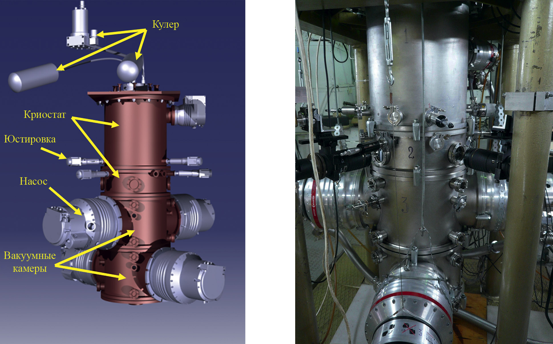 Рис. 1. Рисунок внешнего вида (структуры) мишени (слева) и фотография криостата мишени (справа).
