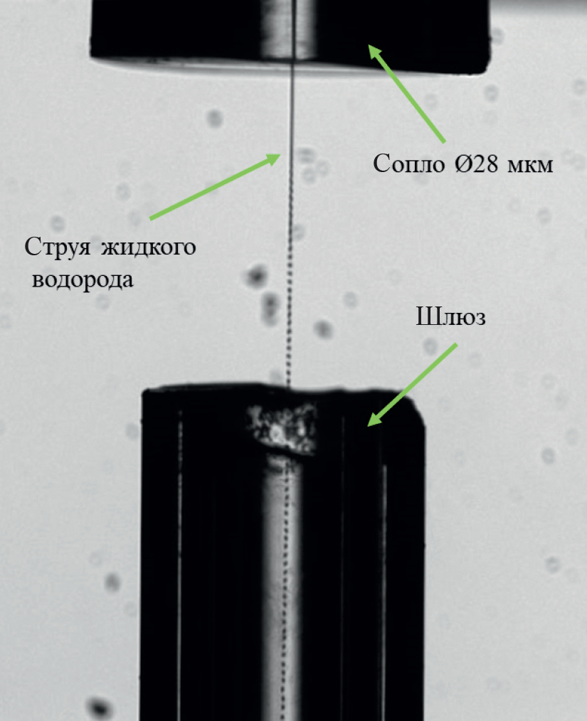 Режим ВКРС реализуется при включении установленного на корпусе конфузорного насадка пьезоэлектрического преобразователя, колебания которого передаются жидкой струе водорода. В результате истекающая из насадка непрерывная струя водорода диспергируется, образуя поток монодисперсных капель. Пример тенеграфического изображения истечения жидкой струи водорода из насадка и диспергирования в режиме ВКРС с образованием монодисперсного потока и входа потока в шлюз представлен на рис. 3.
