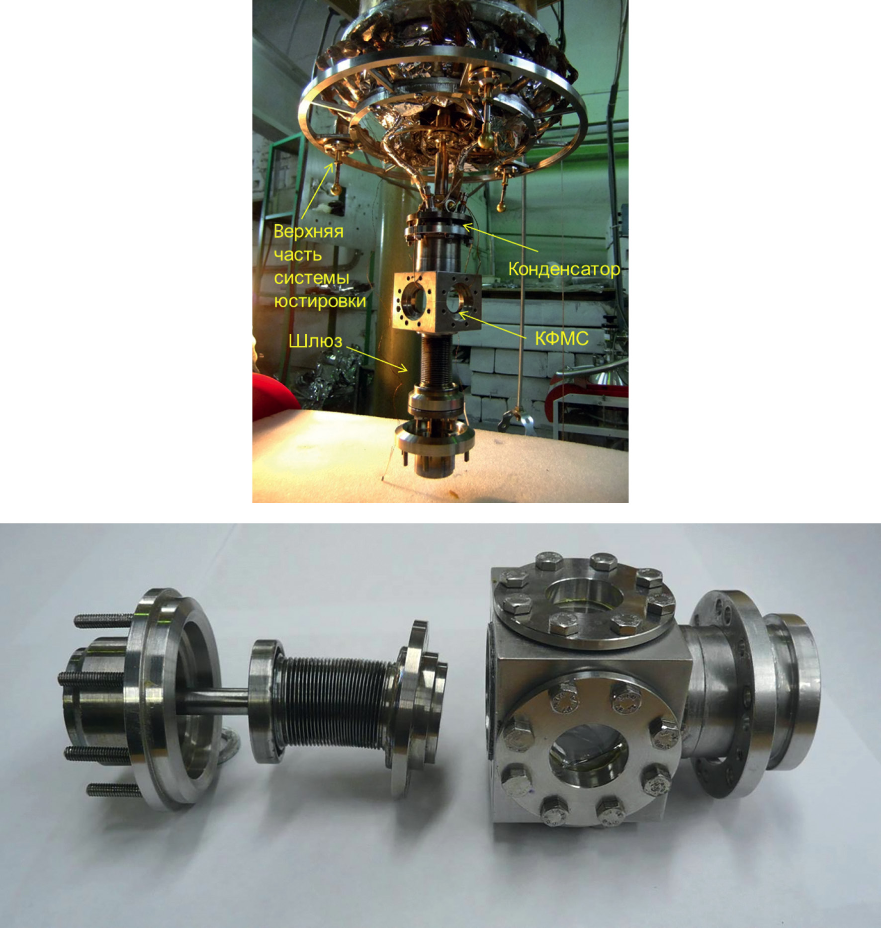 Рис. 4. Фотография камеры формирования монодисперсной струи. Вверху – обзорная фотография шлюза и камеры КФМС при снятом корпусе криостата, внизу слева — фотография шлюза, внизу справа – фотография камеры КФМС с установленными окнами.