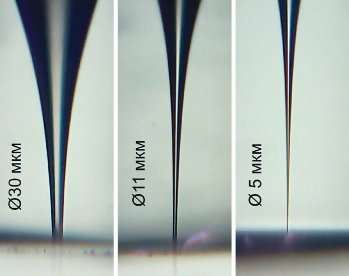 В процессе формирования профиля криогенной микроструи важную роль играет геометрия канала истечения. Освоена технология изготовления стеклянных конфузорных насадков с выходными отверстиями от 5 до 50 мкм и с оптимальными углами сужения канала. Изображения профилей нескольких изготовленных насадков с различными диаметрами выходных отверстий каналов истечения показаны на рис. 5.