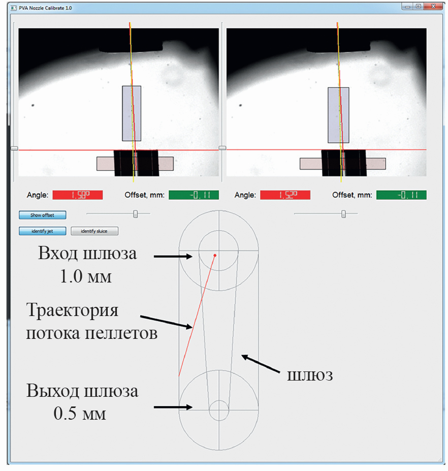 Из-за высокой скорости движения микромишеней (до 100 м/с после инжекции в вакуум) для формирования тенеграфических изображений микромишеней с минимальным размытием время экспозиции кадров регулируется в диапазоне 100–1000 нс. Экспозиция кадров обеспечивается с помощью короткоимпульсных стробируемых светодиодных LED-излучателей [19]. Важным элементом установки является подсистема юстировки, включающая шарнирный механизм, управляемый механическими вакуумными вводами с переходником на шаговые двигатели. Контроль за процессом юстировки реализуется в онлайн-режиме при помощи разработанной на языке Python программы Nozzle calibrate [20], по данным тенеграфических изображений проводится построение траектории струи, оси выходного шлюза, взаимных углов оси потока микромишеней и шлюза. Пример работы программы Nozzle calibrate показан на рис. 6.