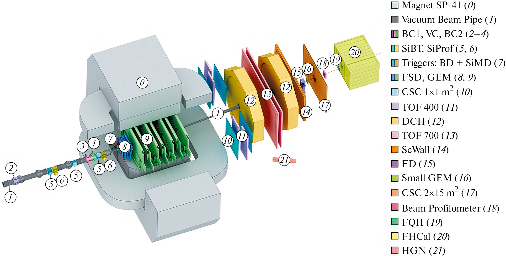 Идентификация частиц осуществляется путем измерения времени пролета с помощью времяпролетных детекторов TOF-400 и TOF-700, размещенных на расстоянии 4 м и 7 м от мишени соответственно. Они состоят из многозазорных резистивных плоских камер (МRPC) со стриповым считыванием и обеспечивают временное разрешение 80 пс для TOF-400 и 115 пс для TOF-700. Эти детекторные системы позволяют идентифицировать адроны (π, K, p), а также легкие ядра с импульсом до нескольких ГэВ/с, образующиеся при столкновениях ядер с мишенью. Трековая система состоит из трех плоскостей двухкоординатных кремниевых детекторов (STS), семи трековых станций на основе трехзазорных камер газового электронного умножения (GEM), установленных в магните, и двух катодно-дрейфовых камер (CDC), расположенных за магнитом. Система STS + GEM позволяет измерять импульсы заряженных частиц с относительной ошибкой от 2.5% для импульса 0.5 ГэВ/с до 4.5% для импульса 3.5 ГэВ/с. Эта система также обеспечивает измерения множественности рождающихся заряженных частиц, которую можно использовать в качестве дополнительной оценки центральности столкновения. Для измерения центральности и ориентации плоскости реакции при ядерно-ядерном столкновении используется передний адронный калориметр (FHCal) вместе с передним кварцевым годоскопом (FQH) и многоканальной сцинтилляционной стенкой (ScWall), последняя также используется для измерения заряженных фрагментов-спектаторов. Также установка содержит пучковые и триггерные детекторы, показанные на рис. 2.