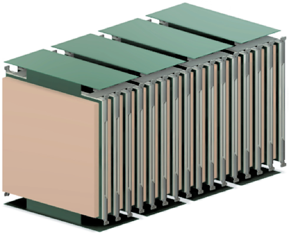Одна плата считывания с тремя ПЛИС будет содержать 250 каналов, а всего потребуется восемь плат для считывания всех каналов детектора HGND. Платы считывания содержат все тепловыделяющие компоненты, такие как ПЛИС, микросхемы источников питания и приемопередатчики связи. Каждая из плат считывания соединяется с четырьмя частями (полуслоями) печатных плат с фотодиодами через краевые разъемы печатной платы. Схематический вид детектора HGND показан на рис. 5. Система считывания на базе ПЛИС синхронизируется по времени с сетью White Rabbit и будет интегрирована в общую систему сбора данных эксперимента BM@N.