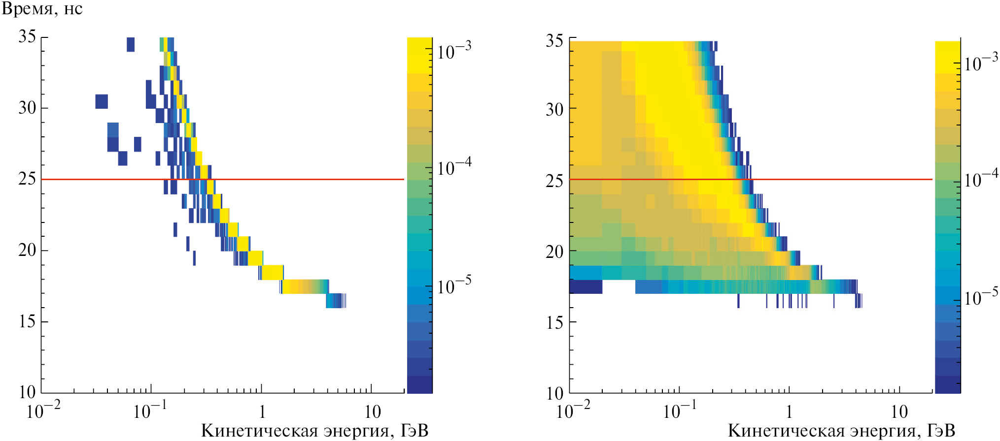 Моделирование детектора HGND методом Монте-Карло было проведено для изучения его аксептанса по быстроте и поперечному импульсу детектируемых нейтронов, эффективности регистрации нейтронов, оценки загрузки, фоновых условий и т.д. Около 106 событий без ограничений на центральность для реакции Bi + Bi при энергии 3.0 АГэВ было получено с помощью генератора событий DCM-QGSM-SMM [22, 23]. Прохождение частиц через детекторы BM@N и HGND было смоделировано с помощью пакета GEANT4 [24], интегрированного в программный пакет BmnRoot [25]. Детектор HGND при моделировании располагался под углом 17° относительно оси ионного пучка на расстоянии 500 см от мишени. Зависимость времени пролета первичных нейтронов от мишени до входной поверхности детектора HGND от их кинетической энергии показана на рис. 6 слева. Тот же график для фоновых нейтронов и всех заряженных частиц, попавших в объем детектора HGND с любых его сторон, показан на рис. 6 справа. Для уменьшения значительной части фона предлагается анализировать только частицы, попадающие на детектор HGND в первые 25 нс после взаимодействия иона в мишени (горизонтальные линии на рис. 6). При этом спектр первичных нейтронов будет начинаться с кинетической энергии 300 МэВ. Число фоновых нейтронов в этом диапазоне энергий уменьшится примерно в 6 раз.