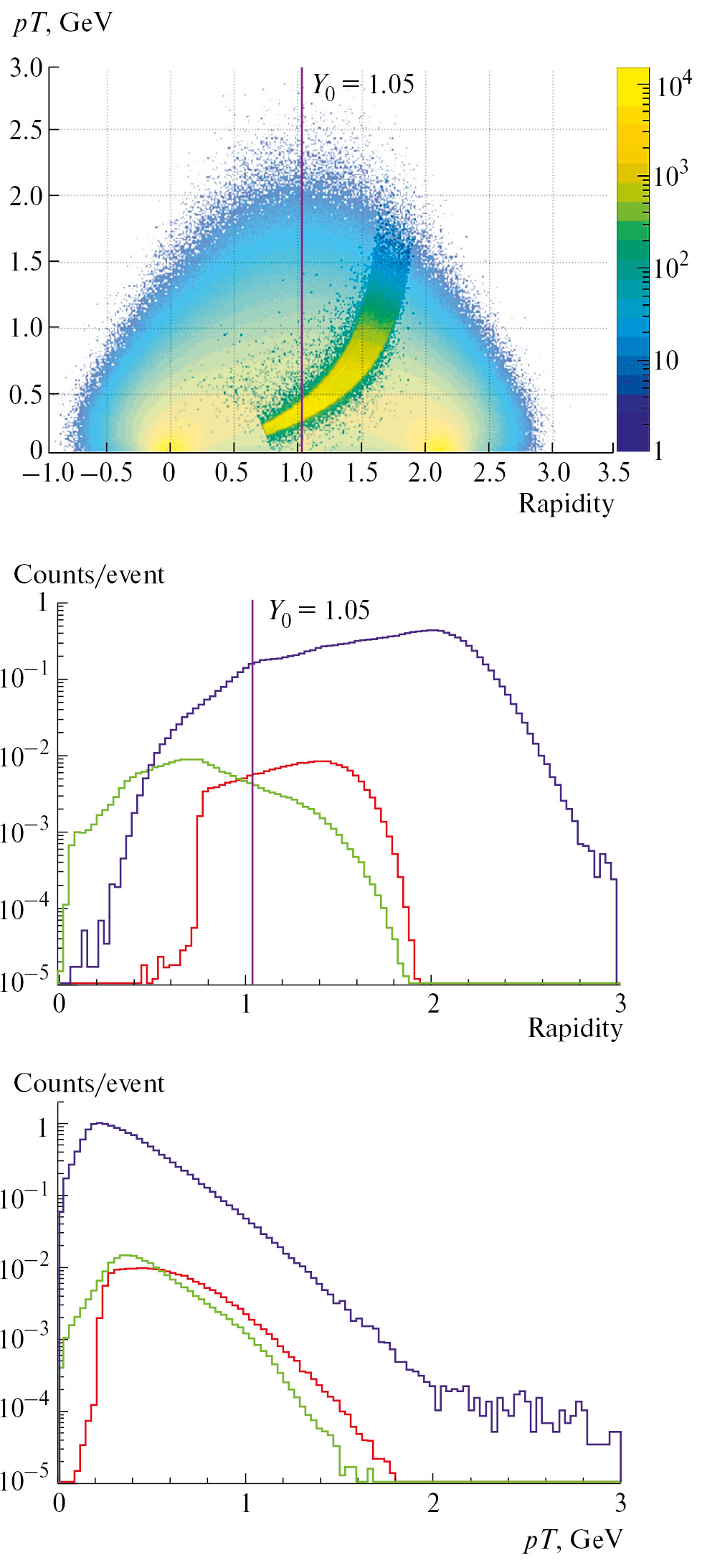 График зависимости поперечного импульса от быстроты показан на рис. 7 сверху. Здесь показан аксептанс детектора HGND для первичных нейтронов с отбором по времени пролета от мишени до HGND менее 25 нс. Распределения по быстроте и поперечному импульсу первичных нейтронов (красная кривая) и фоновых нейтронов (зеленая кривая) показаны на рис. 7 (в центре и снизу соответственно). Видно, что под этим углом детектор HGND будет регистрировать первичные нейтроны в диапазоне быстрот 0.8–1.8, включая область средней быстроты y0 = 1.05, как показано розовой вертикальной линией. Для сравнения, синими кривыми показаны распределения протонов по быстроте и поперечному импульсу, измеренные спектрометром BM@N.