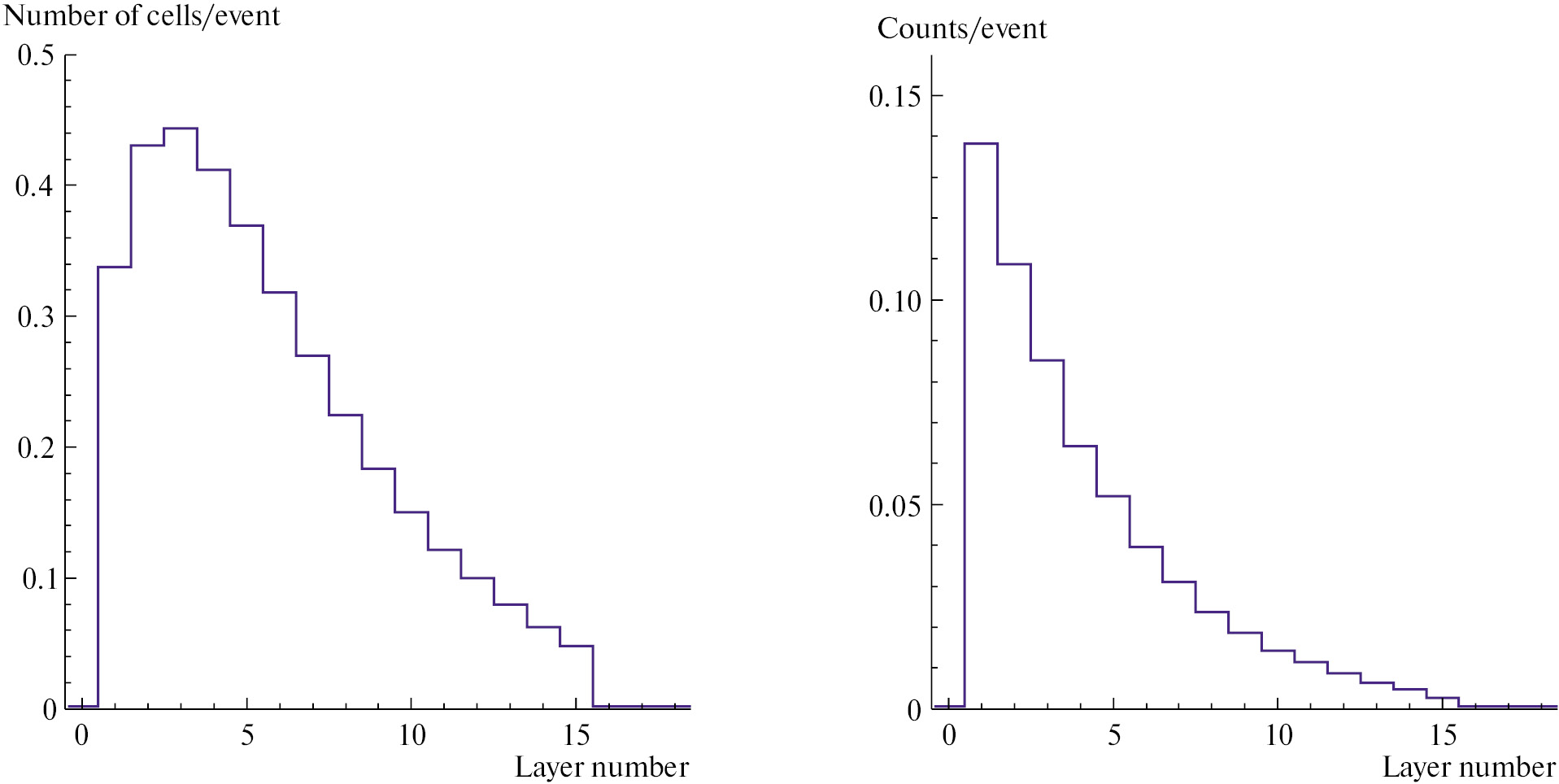 В настоящее время ведется разработка методов идентификации нейтронов и реконструкции их энергий в HGND с реалистичным фоном и множественностью нейтронов. Тем не менее верхний предел эффективности регистрации HGND можно оценить по моделированию первичных нейтронов с множественностью равной единице. Эти нейтроны проходят через детектор HGND и вызывают срабатывания некоторых ячеек в активных слоях детектора. Распределение слоев по количеству срабатываний ячеек на одно событие, показано на рис. 10 слева. Распределение слоев с первым срабатыванием ячейки в событии показано на рис. 10 справа.