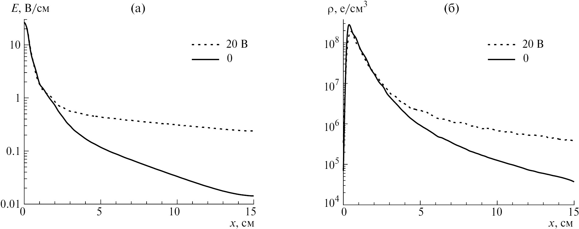 Распределение потенциала показано на рис. 2. Результирующее электрическое поле и распределение плотности электронов для различных токов эмиттера и приложенных потенциалах (рис. 3) было смоделировано путем итеративного решения уравнения Пуассона с использованием метода “частица в ячейке” в газовой среде [15].