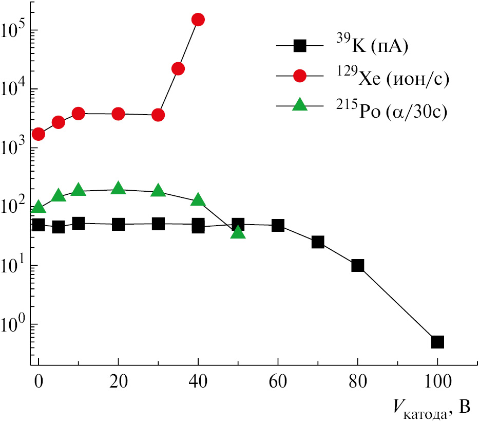 Рис. 5. Зависимости количества ионов 39K, счета ионов 129Xe и альфа-частиц из распада 215Po от напряжения на катоде ячейки. Данные получены при давлении 50 Торр.