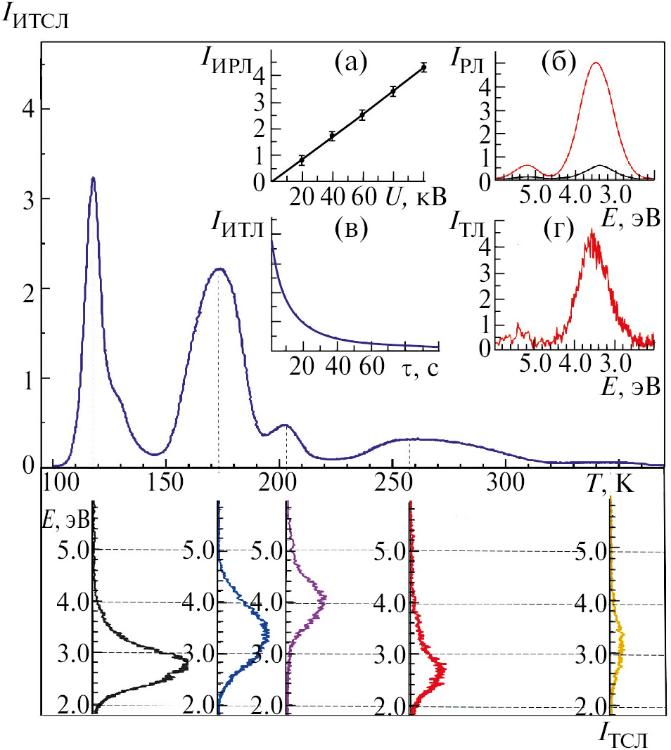 Интегральная термостимулированная люминесценция IИТСЛ = f(T) регистрировалась со скоростью линейного нагрева 0.2 К (тракт Кристалл→ФЭУ-1 на рис. 1; верхняя панель рис. 2). Спектральный состав термостимулированной люминесценции IТСЛ = f(hν) сканировался с максимальной скоростью 50 нм/с [8] (тракт Кристалл→МСД-2→ФЭУ-2 на рис. 1; нижняя панель рис. 2). За время сканирования каждого спектра ТСЛ в интервале 2.0-6.0 эВ температура образца изменялась на 1.0-1.5 К, что вполне удовлетворительно, так как полуширина пиков ИТСЛ находится в интервале 8-20 К. По природе термостимулированная люминесценция является излучательной рекомбинацией радиационных дефектов, созданных под действием ионизирующей радиации. При регистрации спектров ТСЛ выбиралось оптимальное время рентгеновского облучения с тем, чтобы сигнал был вполне регистрируемый, но при этом не создавалось такое количество F-центров, которое искажало бы спектры излучения из-за реабсорбции.