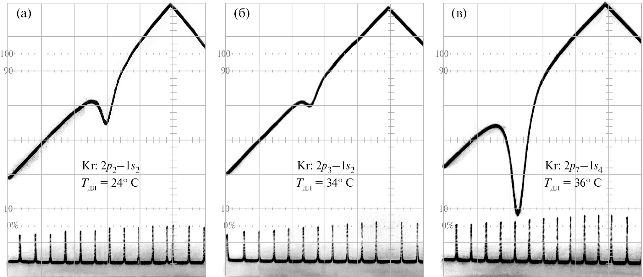 Рис. 3. Точная настройка ДЛВКР на линии Kr: а — 826.3 нм, б — 828.1 нм, в — 829.4 нм. Температуры лазера соответствуют данным рис. 2 в зависимости от линии Kr. Постоянные составляющие тока накачки устанавливались в интервале 30–60 мА. Внизу показаны резонансы интерферометра-1 (FSR = 1.38 ГГц).