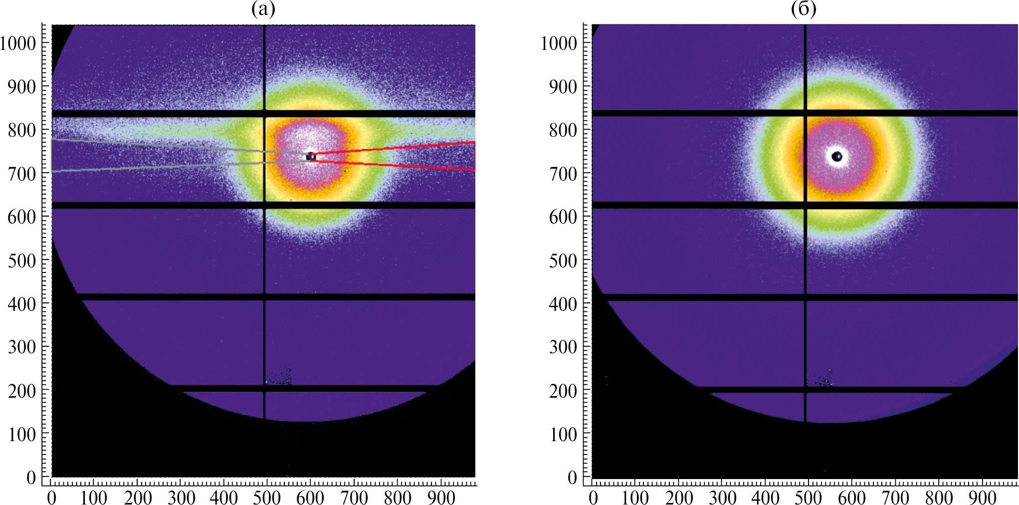 Наличие теневых областей на рентгенограмме при проведении экспериментов в капилляре приводит к тому, что для интегрирования без искажения конечной кривой МУРР остается доступной только область внутри капилляра (показана красным на рис. 3а). Попытки интегрирования в более широкой области приводят к тому, что вклад в интенсивность кривой МУРР начинают давать также эти теневые области, и это приводит к искажению сигнала.