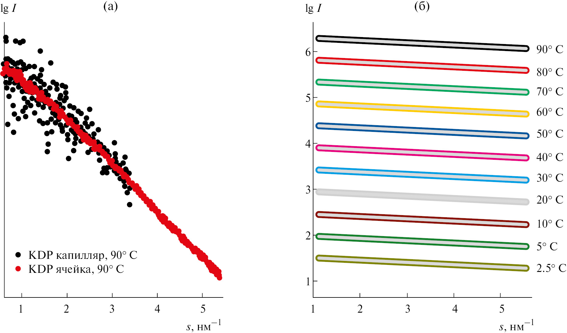 На рис. 5а представлено сравнение экспериментальных кривых МУРР в растворах KDP в капилляре и в ячейке.