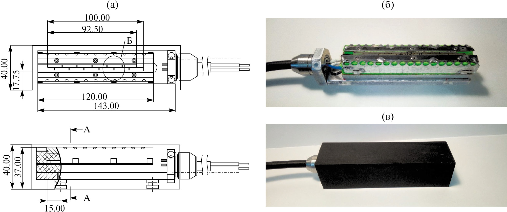 Рис. 1. Конструкция макета антенны ГБО: а — эскиз макета, б — макет до герметизации, в — макет после герметизации.