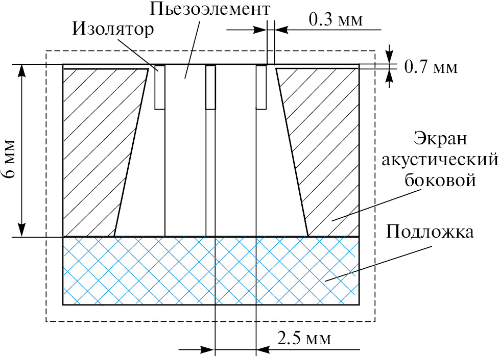 Рис. 3. Эскиз макета № 2 антенны ГБО (боковые акустические экраны на 0.7 мм ниже поверхности пьезоблока).