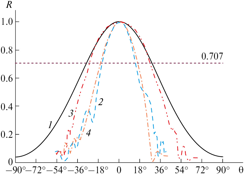 Рис. 5. Диаграммы направленности макетов антенны ГБО: 1 — расчетная ДН макета антенны ГБ, 2 — измеренная ДН макета №1, 3 — измеренная ДН макета №2, 4 — измеренная ДН макета №3.