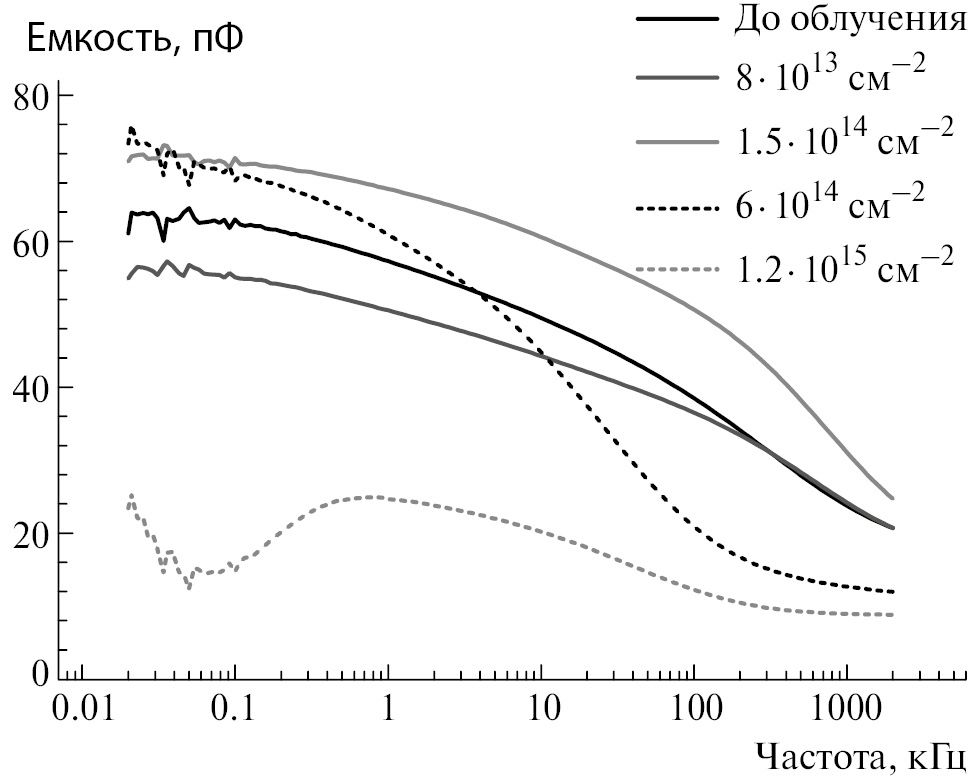 Зависимость емкости диода от измерительной частоты показывает, насколько быстро успевает перезаряжаться структура. В диодах на базе прямозонных материалов это время связано со временем удаления носителей из базы и концентрацией центров захвата. В диодах на базе непрямозонных полупроводников, в частности монокристаллического кремния, время перезарядки области пространственного заряда определяется главным образом временем жизни неравновесных носителей заряда. При облучении время жизни уменьшается за счет увеличения концентрации рекомбинационных центров (как правило, это пары Френкеля [8]), за счет чего начинает возрастать граничная частота, fгр, p–n-перехода (которая может быть определена как частота, при которой высокочастотная емкость падает вдвое по сравнению с низкочастотной). Возрастание это немонотонное: с увеличением поглощенной дозы начинают сказываться эффекты деградации электрических характеристик. При облучении увеличивается характерное время релаксации RC-цепочки τRC, образованной последовательным сопротивлением RS и емкостью области пространственного заряда. В тот момент, когда частота fгр начинает в первую очередь определяться временем τRC, дальнейшее облучение будет приводить только к ее уменьшению. Зависимость величины fгр от Ф приведена в табл. 1.