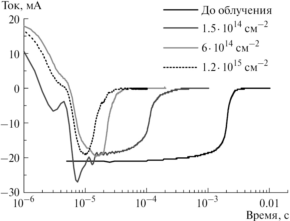 Монотонное уменьшение времени жизни неравновесных носителей заряда свидетельствует об увеличении числа рекомбинационных центров. Основными такими центрами в монокристаллическом кремнии являются комплекс вакансия + кислород (EС — 0.17 эВ), дивакансия (EС — 0.45 эВ), комплекс вакансия + фосфор (EС — 0.4 эВ) и комплекс вакансия + бор (EV + 0.21 эВ) [7, 8, 15–17]. Они работают как рекомбинационные центры и существенно ускоряют переключение устройства. Вместе с этим они связывают электрически активную примесь и тем самым производят компенсирующий эффект, увеличивая последовательное сопротивление структуры.