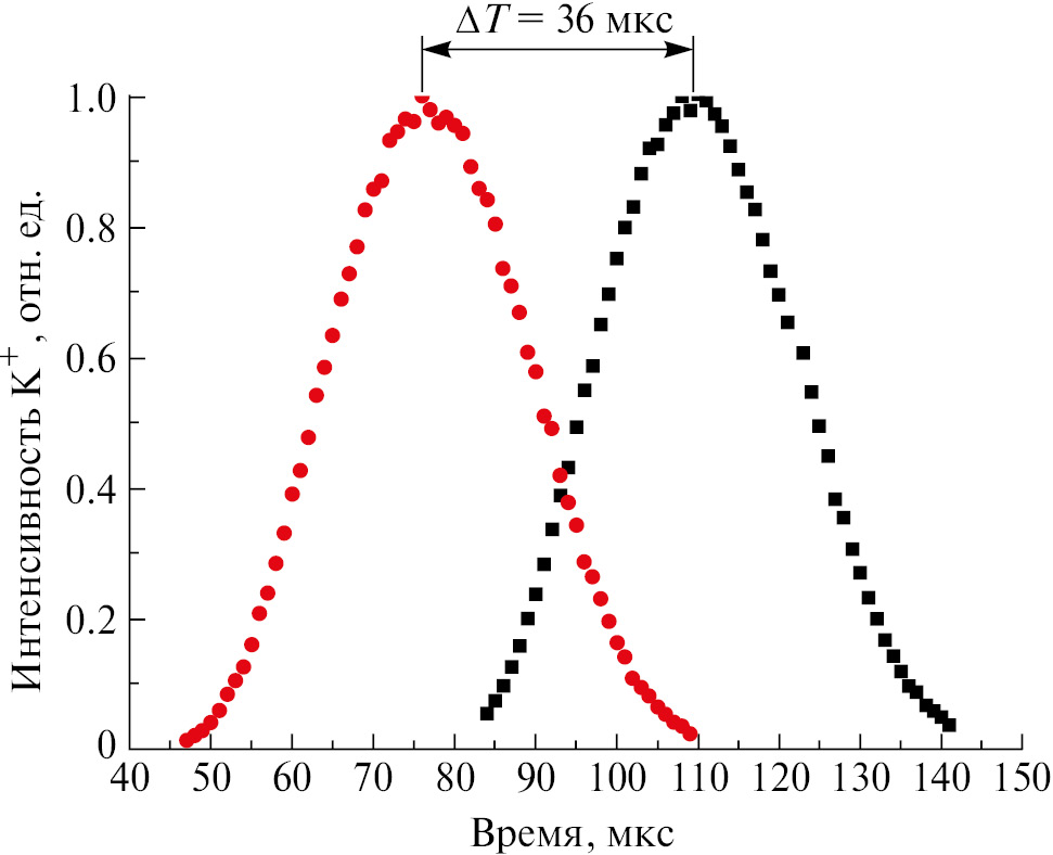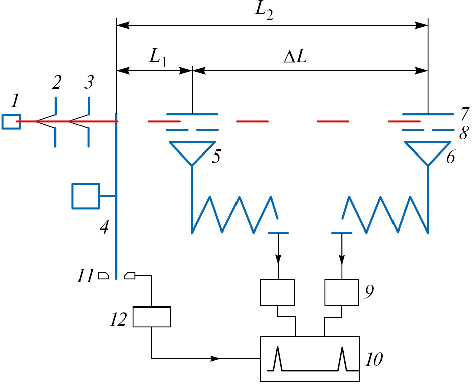 Для ВП-измерений пучок прерывался диском 4 диаметром 100 мм со щелями шириной 1 мм и частотой вращения 250 Гц. При напуске в камеру ксенона до давления 5 · 10–5 Торр и энергии пучка больше порога диссоциативной ионизации молекулы KI ее распад происходит вдоль всей траектории. Положительные ионы K+ регистрировались двумя умножителями 5 и 6 типа ВЭУ-6, установленными вдоль трассы пучка на расстоянии 14.5 см друг от друга с небольшим смещением относительно его оси. Электроды 7 и диафрагмы 8 служили для улучшения сбора ионов и пространственного разрешения. Сигналы с умножителей после усилителя-дискриминатора 9 поступали на ВП-анализатор 10 модуля КАМАК [6] с последующим накоплением и отображением ВП-спектра. Цикл работы многоканального временного анализатора инициировался импульсом от фотодиода 11 через повторитель и формирователь 12. Измеренная умножителями 5 и 6 разность ∆T времен пролета пучка расстояний L1 и L2 соответственно не зависит от аппаратурных задержек и позволяет напрямую определить наиболее вероятную скорость частиц: