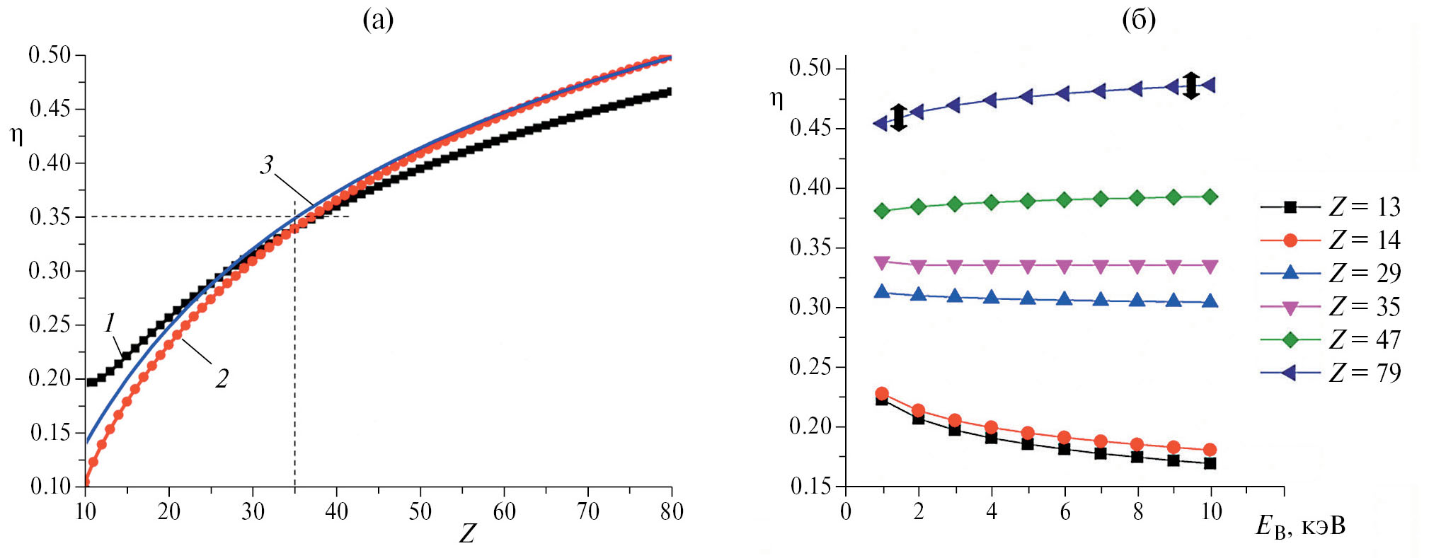 Из рис. 1а следует, что в области малых значений Z различие в величине η(EB) очень велико (в 2 раза). На рис. 2б видно, что в окрестности Z = 35 величина η не зависит от EB, а расчетные и экспериментальные значения разнятся не более, чем на 5%.