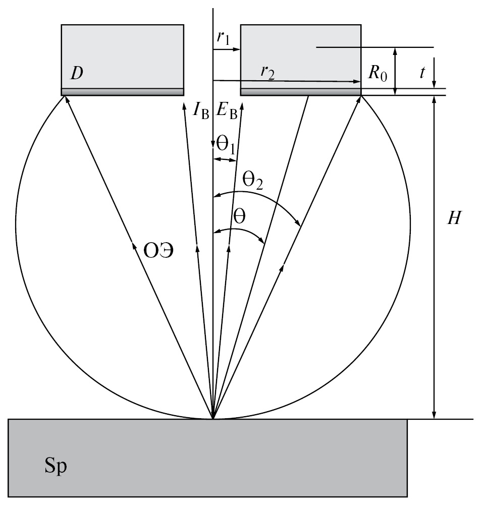 Исходный пучок первичных электронов с током IB и энергией EB облучает образец Sp. На детектор D попадает только та часть электронов, которая движется в пределах телесного угла ∆Ω, ограниченного двумя конусами с растворами углов Ω1 и Ω2. Эти углы, в свою очередь, определяются расстоянием H от образца до детектора и радиусами r1 и r2 рабочих поверхностей детектора. В наших экспериментах r1 = 2 мм, r2 = 10 мм, H = 15 мм, что типично для стандартных СЭМ. В итоге Ω1 = 0.06 ср, Ω2 = 1.07 ср. С учетом косинусного распределения ОЭ по углам вылета несложные вычисления показывают, что долю регистрируемых ОЭ можно выразить эффективным коэффициентом