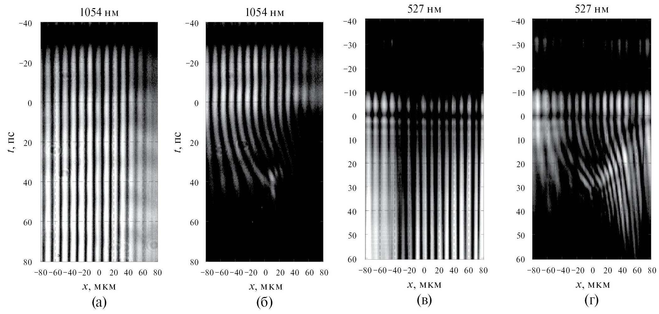 Рис. 4. Экспериментальные интерферограммы: а – опорная интерферограмма на длине волны 1054 нм, б – сигнальная интерферограмма на длине волны 1054 нм, в – опорная интерферограмма на длине волны 527 нм, г – сигнальная интерферограмма на длине волны 527 нм.