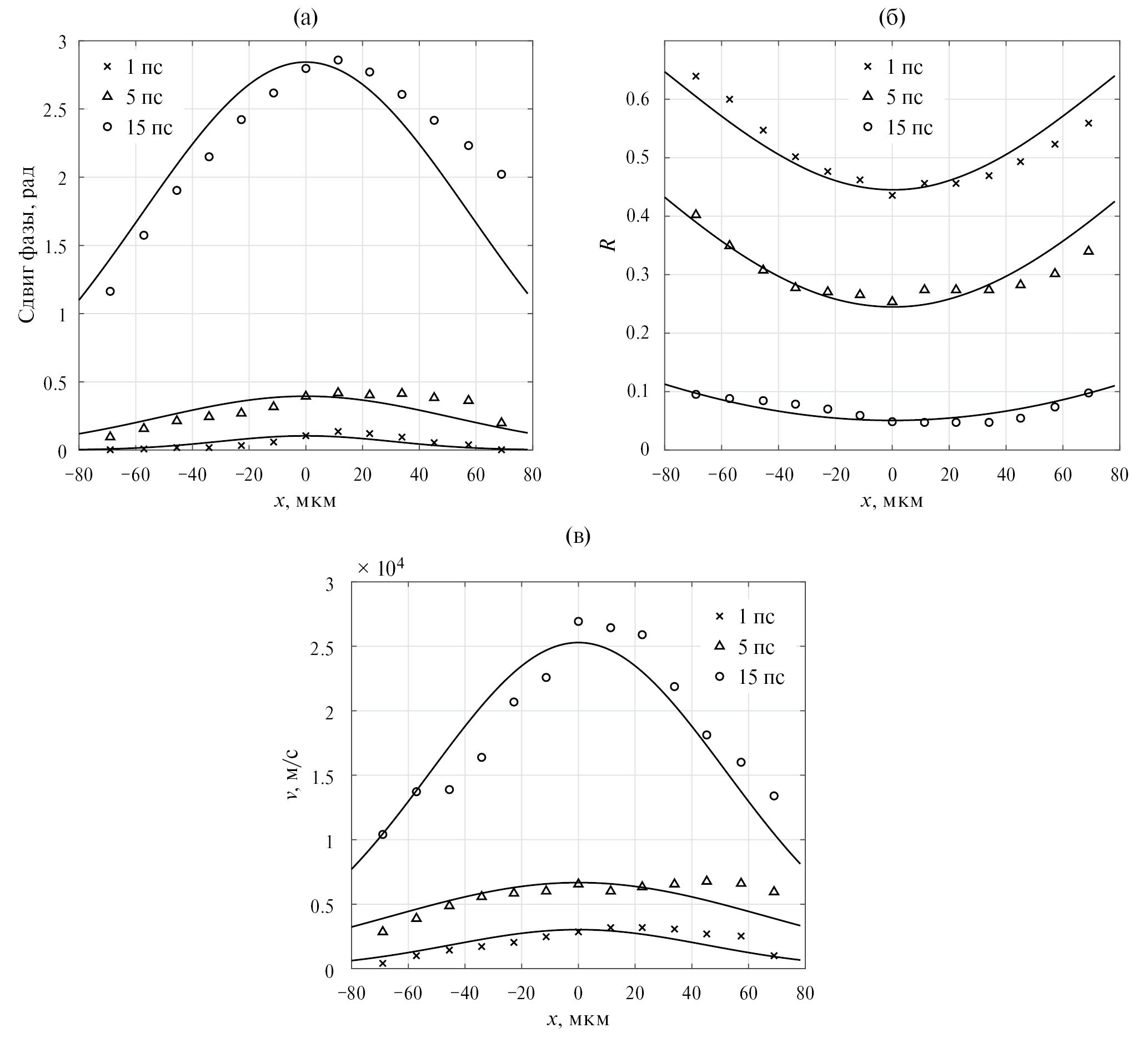 Постановка измерений, примененная в рамках данной работы, позволила определить не только временные, но и пространственные профили фазы и коэффициента отражения. На рис. 6 приведен пример распределений фазового сдвига излучения, коэффициента отражения и скорости движения поверхности по сечению области разлета мишени, полученные на длине волны зондирующего излучения 1054 нм. При обработке интерферограмм в расчет принимались только максимумы интерференционных полос. Профили имеют форму подобную гауссовой, неоднородности различного пространственного масштаба могут быть связаны с особенностями распределения интенсивности греющего излучения в фокальном пятне, остаточными неровностями поверхностей и внутренними дефектами мишени.