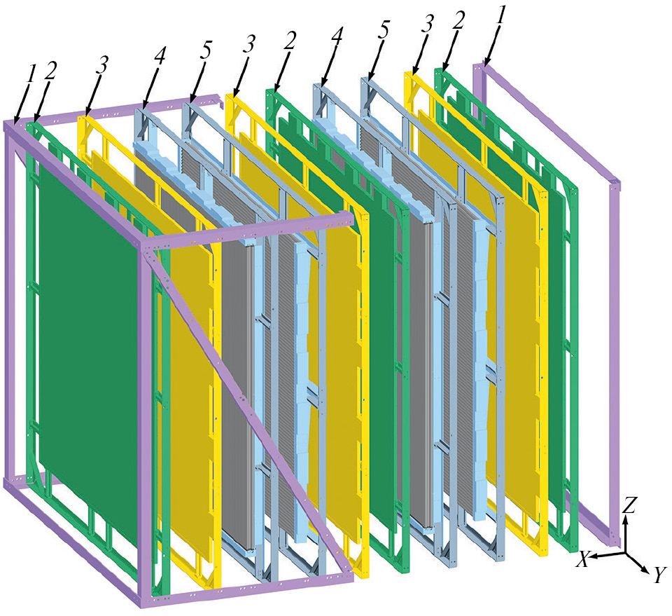 Рис. 2. Трехмерная модель гибридного мюонного годоскопа: 1 – основная несущая рама, 2 – вертикально ориентированная плоскость сцинтилляционного стрипового детектора, 3 – горизонтально ориентированная плоскость сцинтилляционного стрипового детектора, 4 – вертикально ориентированная плоскость детектора на дрейфовых трубках, 5 – горизонтально ориентированная плоскость детектора на дрейфовых трубках.