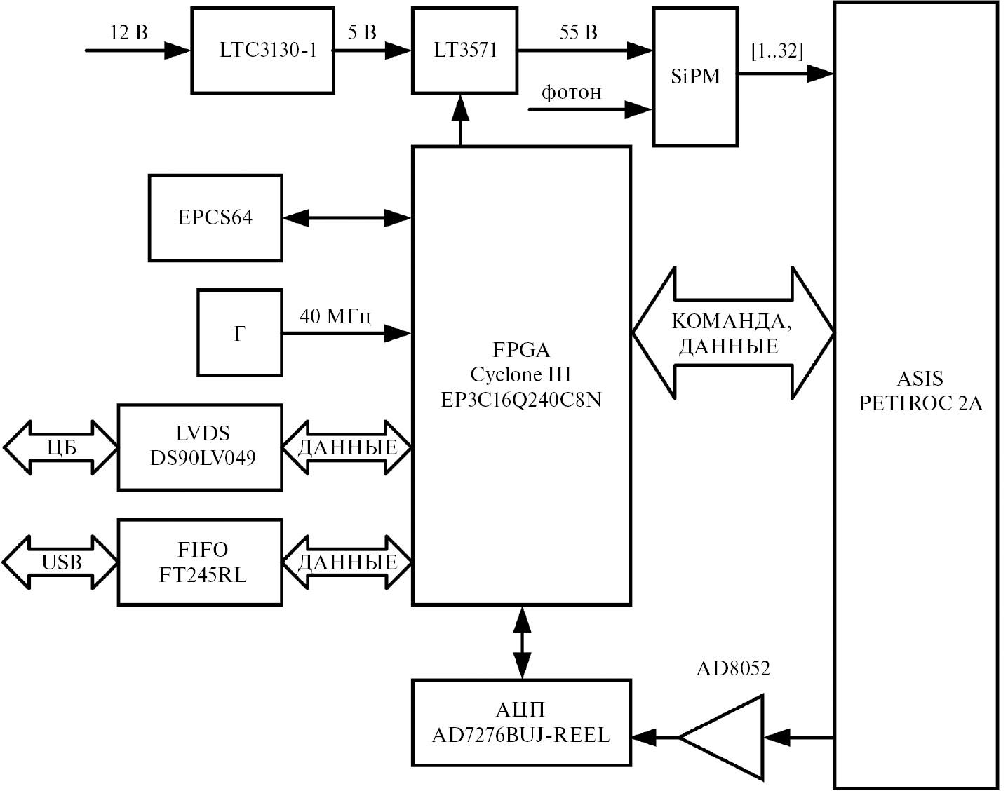 Под данный ASIC была разработана специальная печатная плата, позволяющая подключать 32 SiPM, регулировать их питание, осуществлять настройки различных параметров и передавать данные в оцифрованном виде. Плата содержит в себе преобразователи напряжения питания LTC3130–1 и LT3571, контроллер USB FT245RL и LVDS DS90LV049, интерфейсный блок на ASIC Petiroc 2A, логический блок на FPGA Cyclone III EP3C16Q240C8N, АЦП AD7276BUJ-REEL, устройства последовательной конфигурации EPCS64, а также тактовый генератор с частотой 40 МГц. Структурная схема платы считывания сигналов представлена на рис. 5.