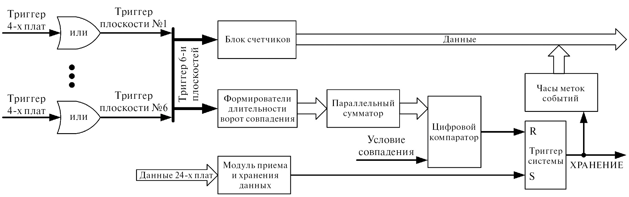 Получаемый с АЦП код подается на программируемую логическую микросхему FPGA Cyclone III EP3C16Q240C8N, которая обеспечивает формирование триггерного сигнала. При выполнении триггерного условия FPGA отправляет сигнал запуска в центральный триггерный блок (ЦБ) и систему сбора данных. При заданной маскируемой кратности поступающих сигналов со сработавших плоскостей ЦБ формирует сигнал на хранение и возвращает его во все FPGA плат базовых модулей. В этом случае данные со всех сработавших каналов считываются и записываться системой сбора данных.