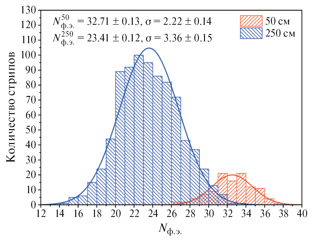 Важной характеристикой стрипа, определяющей его эффективность, является значение ослабления потока фотонов от расстояния. На тестовой выборке с использованием бета-спектрометра было проведено измерение световыхода стрипа в двух точках, соответствующих максимальному (50 см от SiPM) и минимальному (250 см от SiPM) световыходу. Средний световыход от электронов (по бета-спектрометру) в точке 50 см составил 18.58 ± 0.08 фотоэлектронов, а в точке 250 см 13.29 ± 0.05 фотоэлектронов. Полученные распределения световыхода в двух точках, пересчитанные с учетом корреляционного коэффициента, показаны на рис. 10. Расстояние 250 см было выбрано в качестве опорного при тестировании и отборе стрипов. С учетом корреляционного коэффициента средний световыход стрипов от мюонов в точке 50 см составил 32.71 ± 0.13 фотоэлектрона, а в точке 250 см – 23.41 ± 0.12 фотоэлектрона. При этом более детальные измерения (в точках с шагом в 25 см) показали, что зависимость световыхода от длины стрипа убывает монотонно и представляет из-за краевых эффектов более сложную, чем экспонента зависимость.