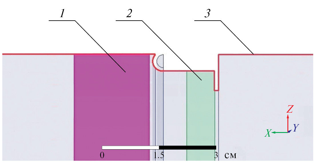 Рис. 3. Часть сечения электромагнитной модели трансформатора (1) для “просветления” вакуумного окна (2), линия протекания поверхностных токов (3).