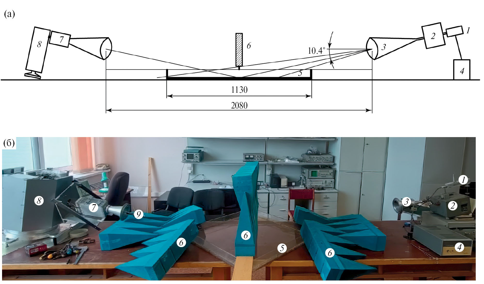 Рис. 1. Схема (вверху) и фотография (внизу) эксперимента: 1 — газоразрядный генератор шума Я5Х-272, 2 — прецизионный аттенюатор Д3-36, 3 — скалярная рупорная антенна, 4 — блок питания генератора шума, 5 — ванна с водой, 6 — поглотители микроволнового диапазона, 7 — радиометр с антенной, 8 — поворотное устройство “Траверс-2”, 9 — лазерная указка, установленная для юстировки измерительной системы.