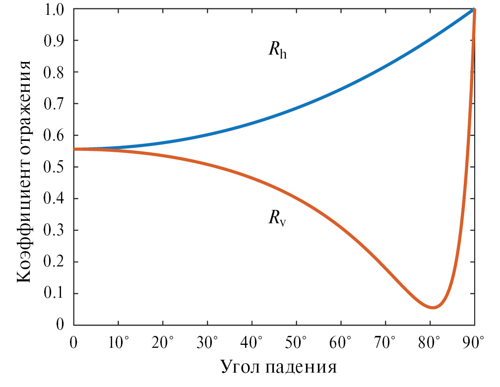 Рис. 2. Зависимость коэффициентов отражения Rv и Rh от угла падения для пресной воды.