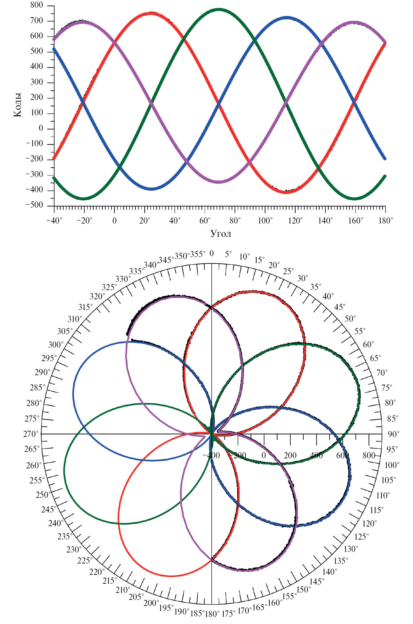 Рис. 3. Пример измерений установки плоскостей поляризации для радиометра R08P1, измеряющего радио-яркостную температуру при горизонтальной (синий цвет), вертикальной (красный) поляризациях и поляризациях, повернутых на 45°(зеленый) и +45°°(сиреневый). Измерения проводились 16.02.2023 с переотражением от воды, угол наклона излучателя и приемника 10.4°±0.2°. Тонкими линиями соответствующих цветов показаны аппроксимации данных функцией A cos2(φ + B) + C. Верхний рисунок приведен в декартовых координатах, нижний – в полярных.