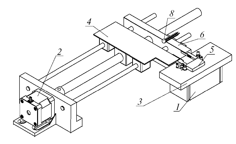 Рис. 2. Эскиз прибора-измерителя предела прочности многослойных стержней: 1 – микроконтроллер, 2 – шаговый двигатель, 3 – направляющая пластина с проградуированной шкалой, 4 – движущаяся полированная пластина, 5 – зажим для оптического волокна, 6 – неподвижная полированная пластина, 8 – датчик давления. Испытуемое на прочность ОВ не показано для лучшей видимости зажима.