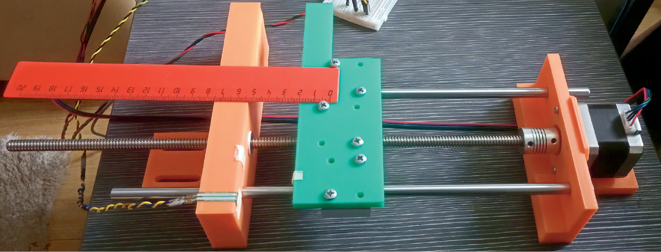 При конструировании прототипа прибора было решено связать шаговый двигатель с микроконтроллером с загруженными в его запоминающее устройство алгоритмами как измерений, так и их первичной обработки – с их помощью возможно использовать прибор в автоматическом режиме. Алгоритмы могут быть изменены и дополнены пользователем в случае надобности; также микроконтроллер поддерживает возможность соединения с рабочими станциями через интерфейсы COM и USB для удаленного управления и более сложной обработки результатов измерений. Также реализован графический интерфейс, который при желании может быть использован для настройки параметров установки, в том числе и “нулевого” положения подвижной пластины, когда она сомкнута с неподвижной пластиной. Для точного задания “нулевого” положения необходимо поместить на устройство шкалу, проградуированную в миллиметрах, с началом отсчета в нижней точке ближнего к подвижной платформе края неподвижной платформы. Желательно указать параметр шага двигателя менее 1 мкм для обеспечения лучшей точности измерений. Прибор измеряет расстояние между пластинами в момент излома образца и вычисляет его прочность, исходя из расчетной формулы, полученной в работе [4]: