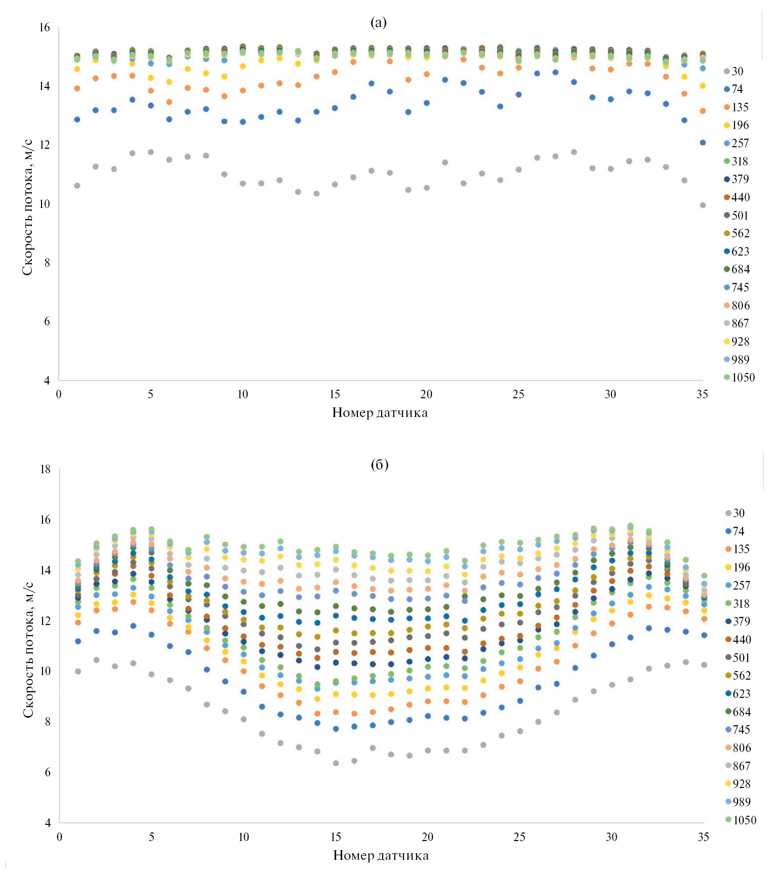 Рис. 5. Профиль скорости: для пустой трубы (а) и трубы с аэродинамическими сопротивлениями и турбулизаторами (б).