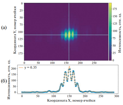 Можно предположить, что отсутствие однооборотных поперечных профилей пучка, подобных тем, что представлены на рис. 6а, б, связано с особенностями записи и считывания изображения CMOS-матрицей камеры.