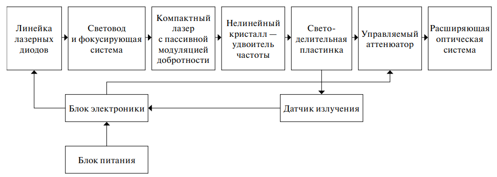 За кристаллом KTP располагается отводная пластина, которая отражает незначительную часть излучения на фотоприемник (датчик излучения). Фотоприемник используется для измерения энергии выходного импульса и мониторинга стабильности работы лазерного источника света. Кроме того, фотоприемник используется для ограничения сигнала накачки после высвечивания импульса лазера, что снижает тепловую нагрузку на кристалл и повышает стабильность его работы. После двух поворотных зеркал, предназначенных для юстировки лазерного пучка в двух плоскостях, пучок излучения расширяется двухлинзовым телескопом до размера около 8 мм. Основная часть излучения проходит через фазовую пластину, придающую излучению круговую поляризацию, далее – через управляемый аттенюатор, где ослабляется до требуемой энергии импульса, после этого – через рассеивающую линзу и световод.