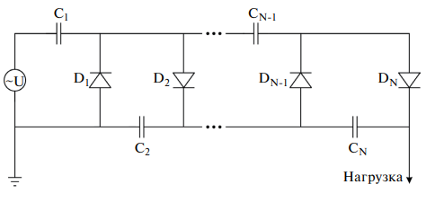 Для оптимизации массы умножителя напряжения была выбрана классическая топология умножителя напряжения (генератора Кокрофта–Уолтона), приведенная на рис. 1. Основные элементами данного устройства являются: источник питания переменного тока ~U; емкости C1, …, CN, где N – порядковый номер емкости/диода; диоды D1, …, DN.