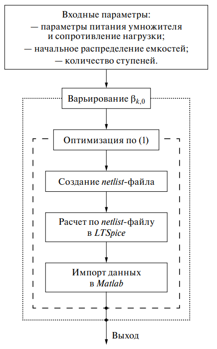 Входными параметрами для начала оптимизации являлись оптимальное количество каскадов умножителя, начальное приближение распределения емкостей, параметры источника питания и нагрузки.