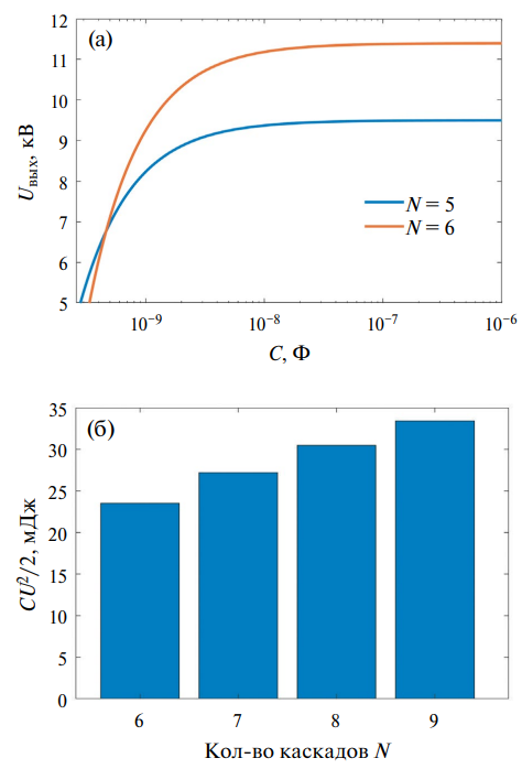 Результаты выбора оптимального количества каскадов, согласно выражению (2), приведены на рис. 3. Согласно кривым, представленным на рис. 3а, минимальное число каскадов для достижения уровня выходного напряжения 10 кВ при заданном токе нагрузки равно 6. Увеличение количества каскадов умножителя свыше данного значения не является необходимым, так как приводит к увеличению общей электрической энергии (рис. 3б), запасенной в емкостях устройства и, как следствие, его массе.