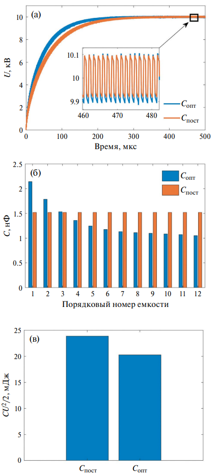 На рис. 7а приведены расчетные осциллограммы выходных напряжений для случаев постоянного и оптимизированного распределений емкостей, отражена суммарная электрическая энергия (рис. 7б), запасенная в емкостях устройства, а также приведен уровень пульсации для двух расчетных случаев.
