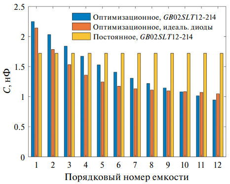 Результаты оптимизационного определения значения емкостей для случаев использования идеализированной модели диодов, а также для случаев постоянного и оптимизационного распределений с применением модели диодов GB02SLT12–214 приведены на рис. 6. В случае постоянного распределения при использовании модели GB02SLT12–214 минимальное значение емкости конденсаторов для достижения требуемого уровня напряжения 10 кВ равно 1.72 нФ.